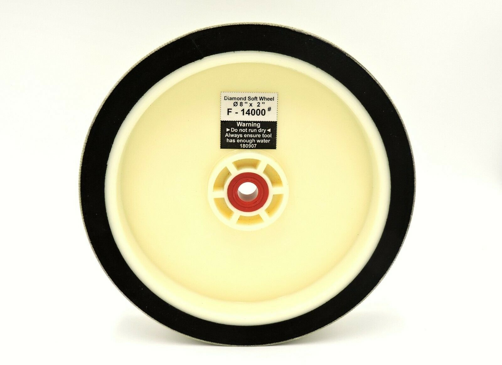 Premium Quality 14000 grit 8 inch x 2 inch diamond soft resin wheel for grinding and polishing.