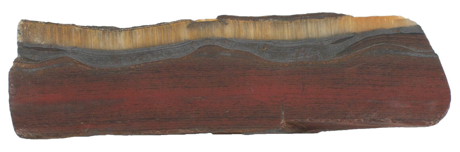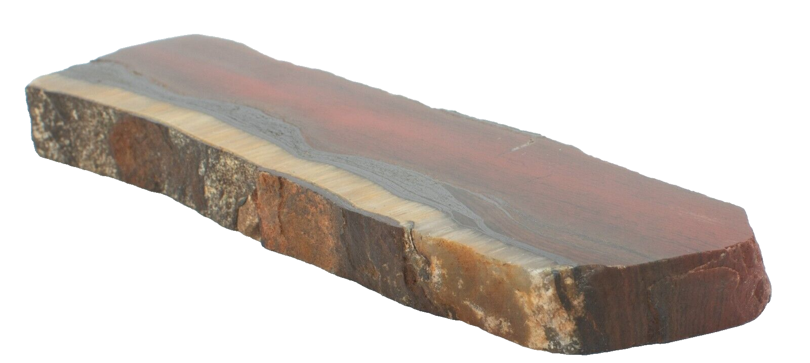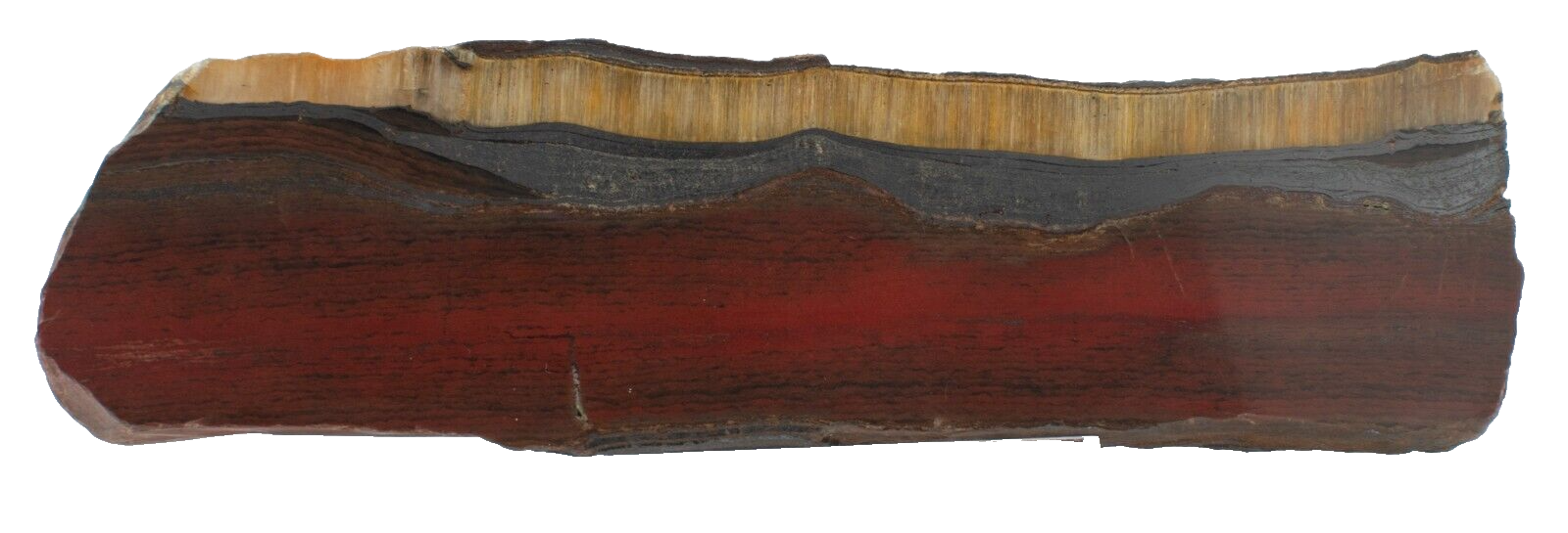 This slice contains a thick layer of jasper with a layer of hematite and a band of totally silicified Chrysotile fibers.