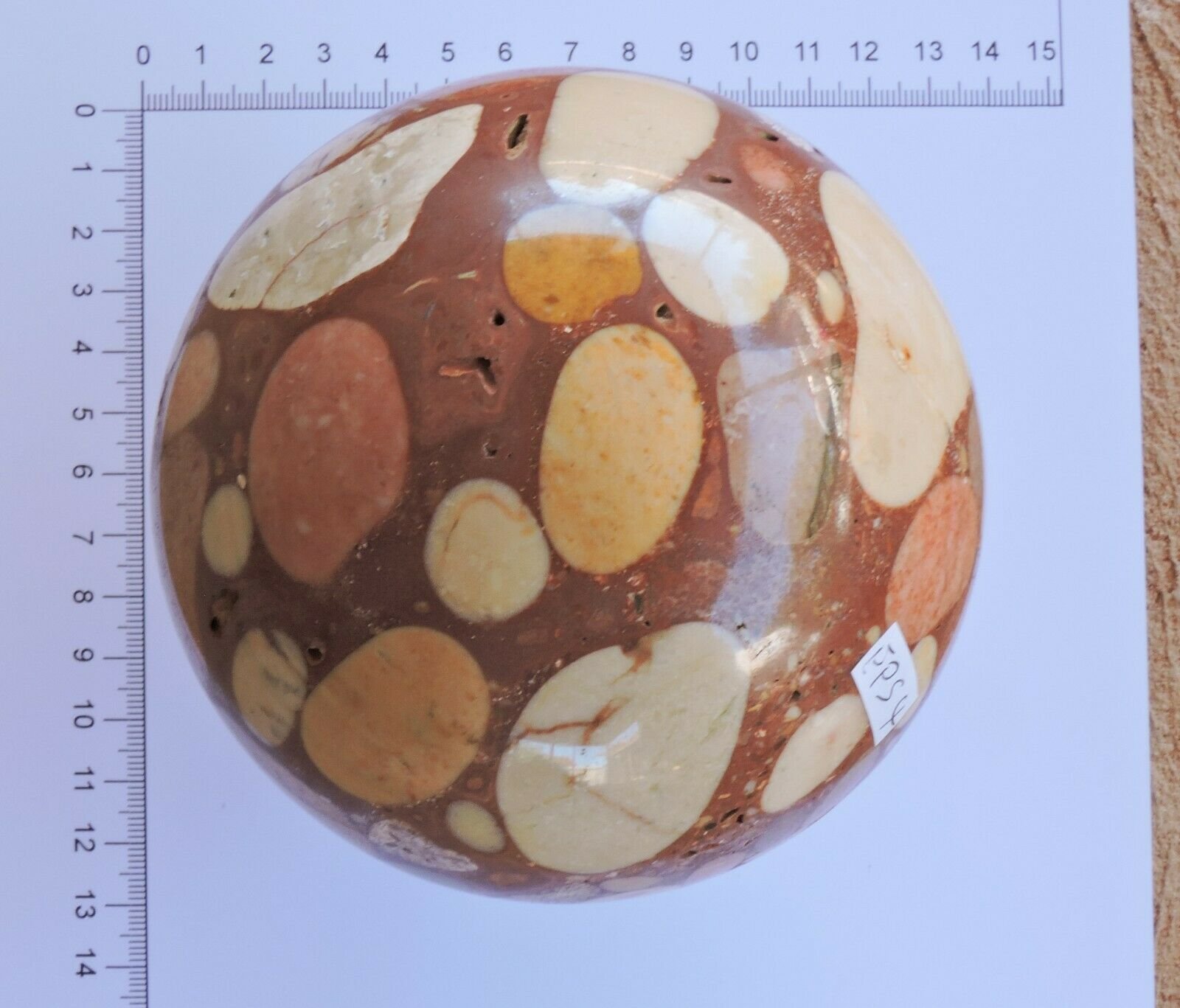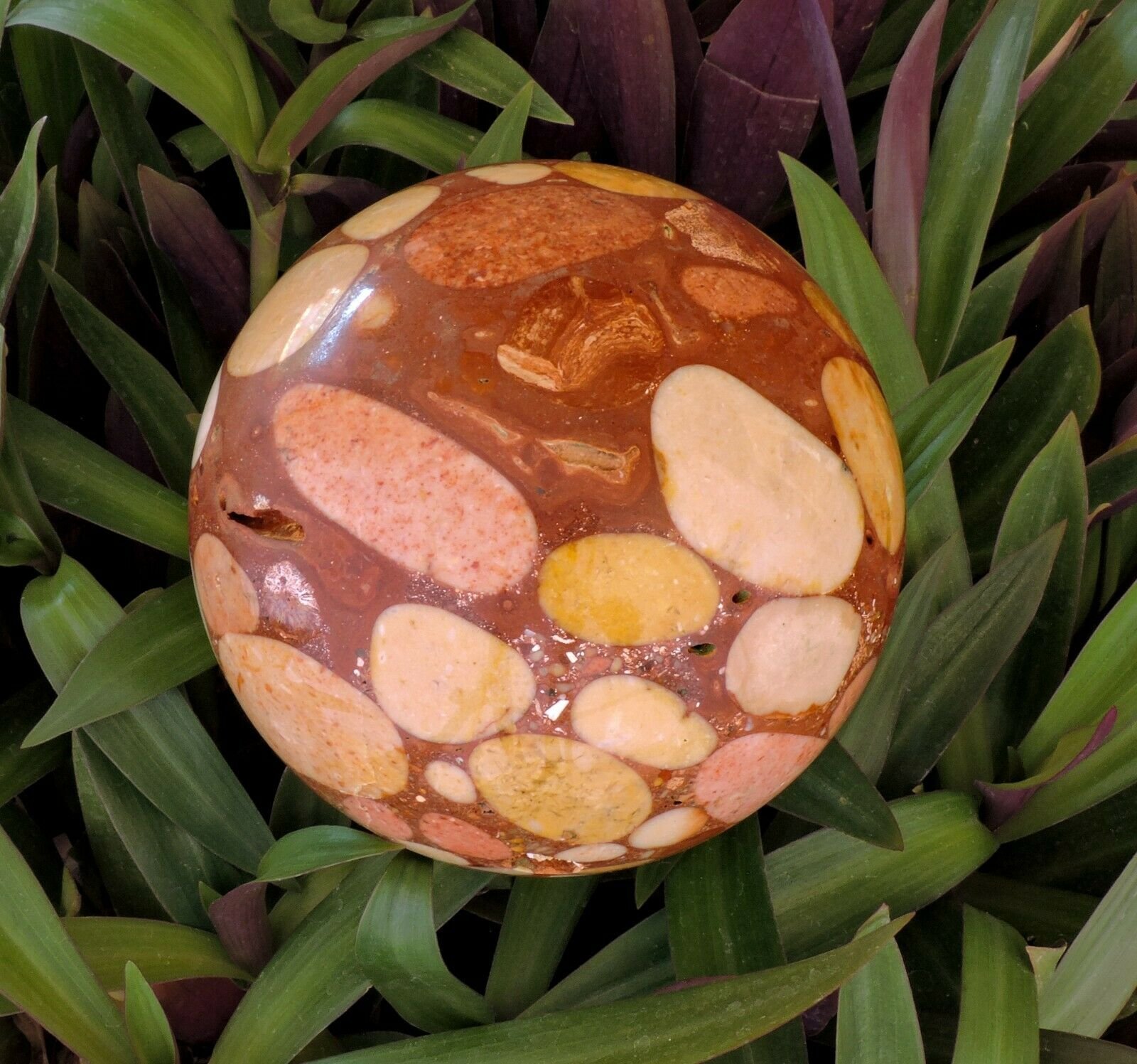 This sphere contains both larger and smaller rocks in the conglomerate as well as crushed shells.