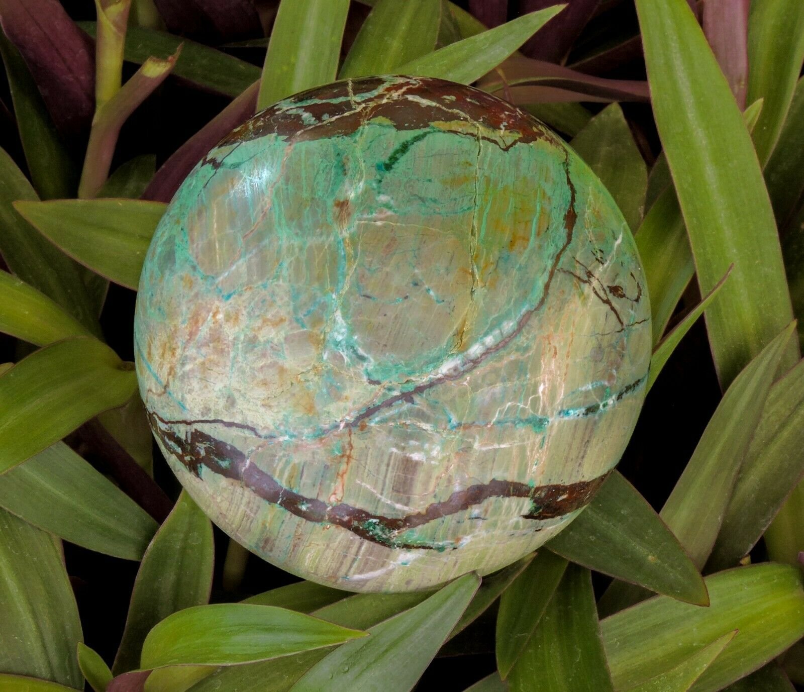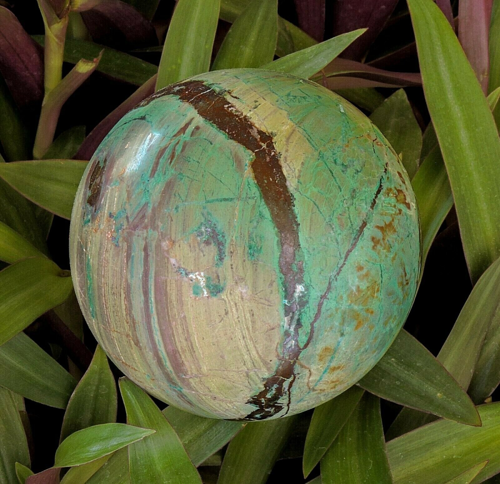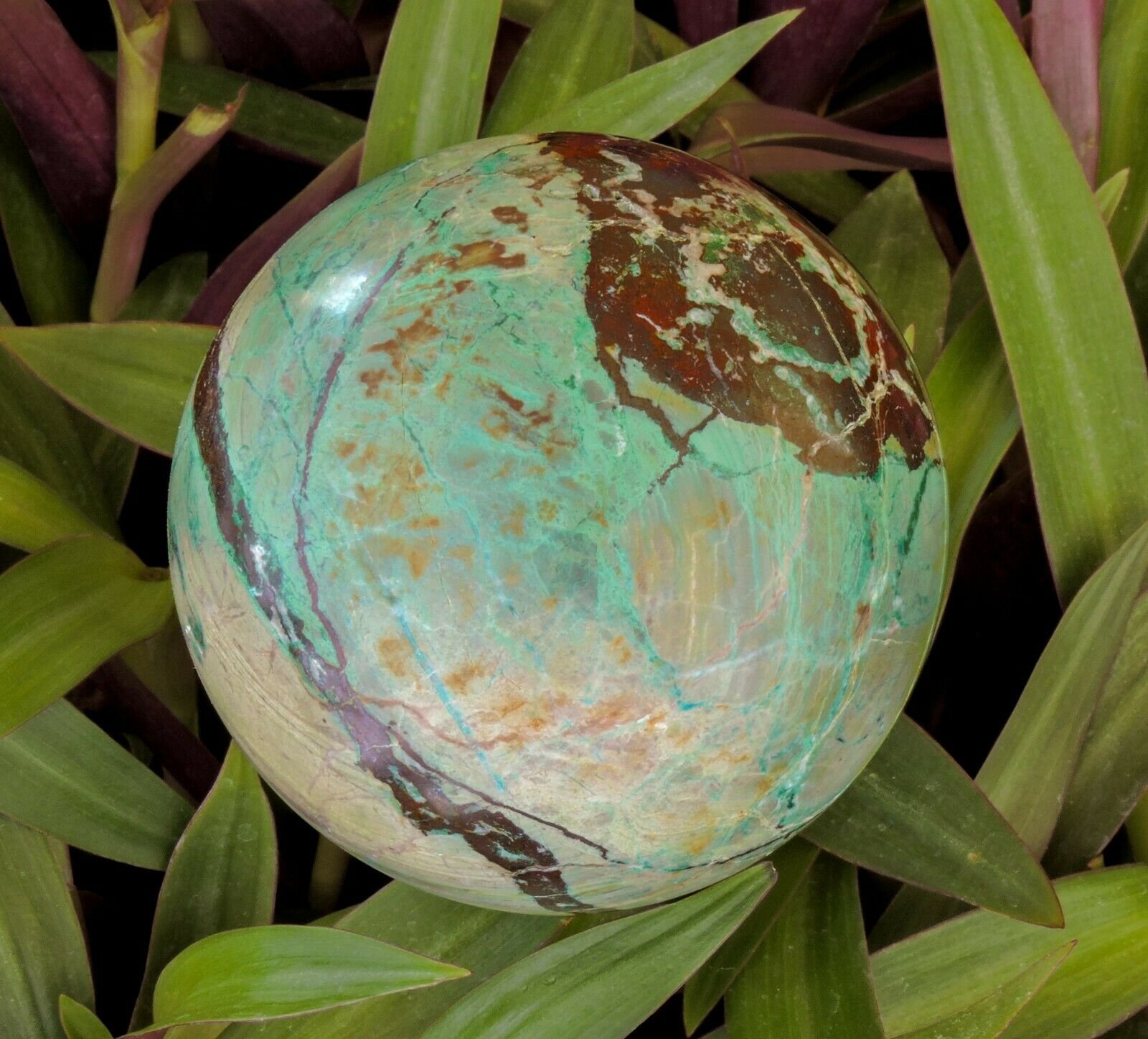 This is a large spectacular sphere of Chrysocolla, Malachite, Jasper and Ironstone. Its hard to get rough material to make this size as it can be very fragile and tends to shatter. The patterns of this are amazing.