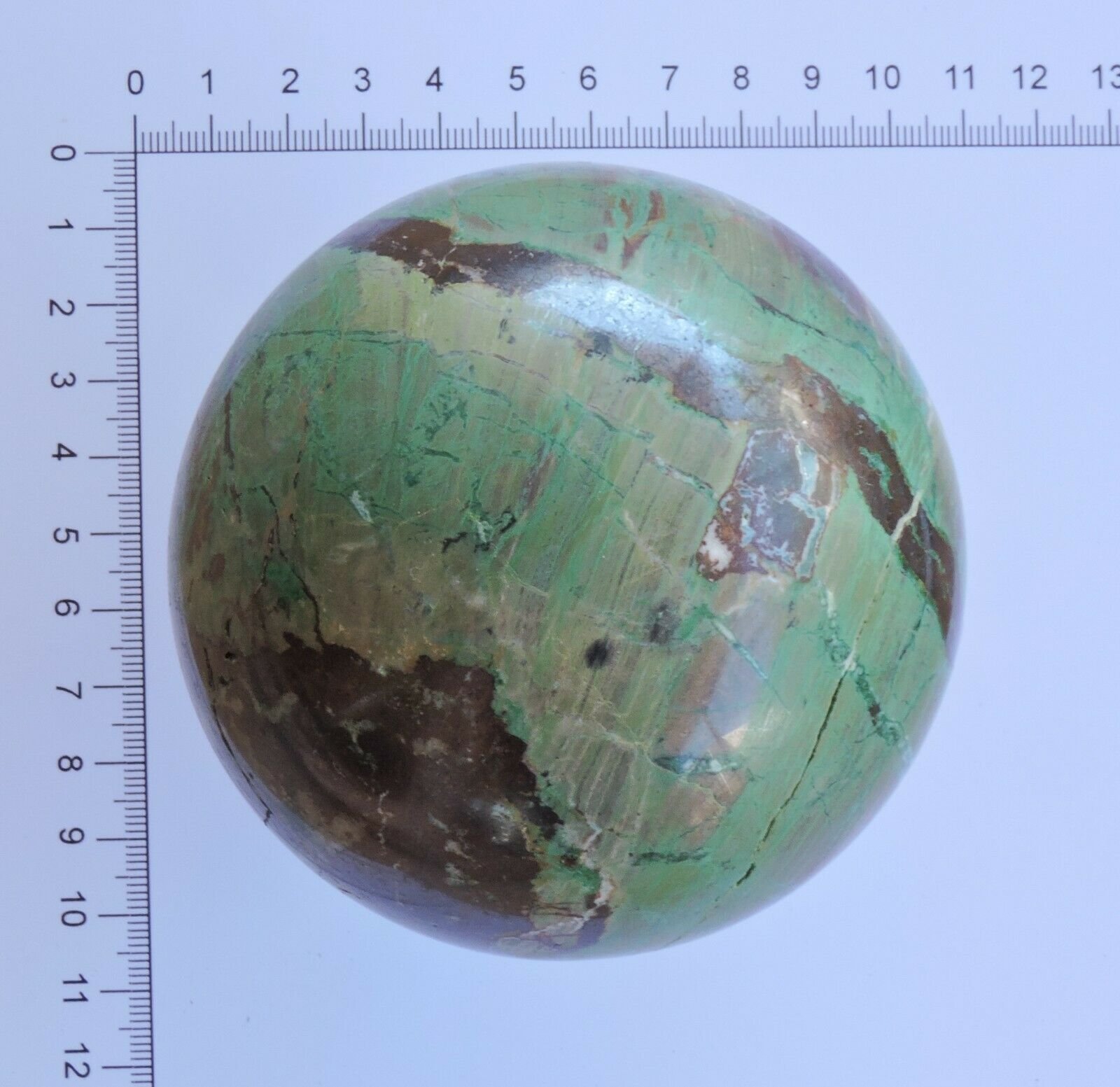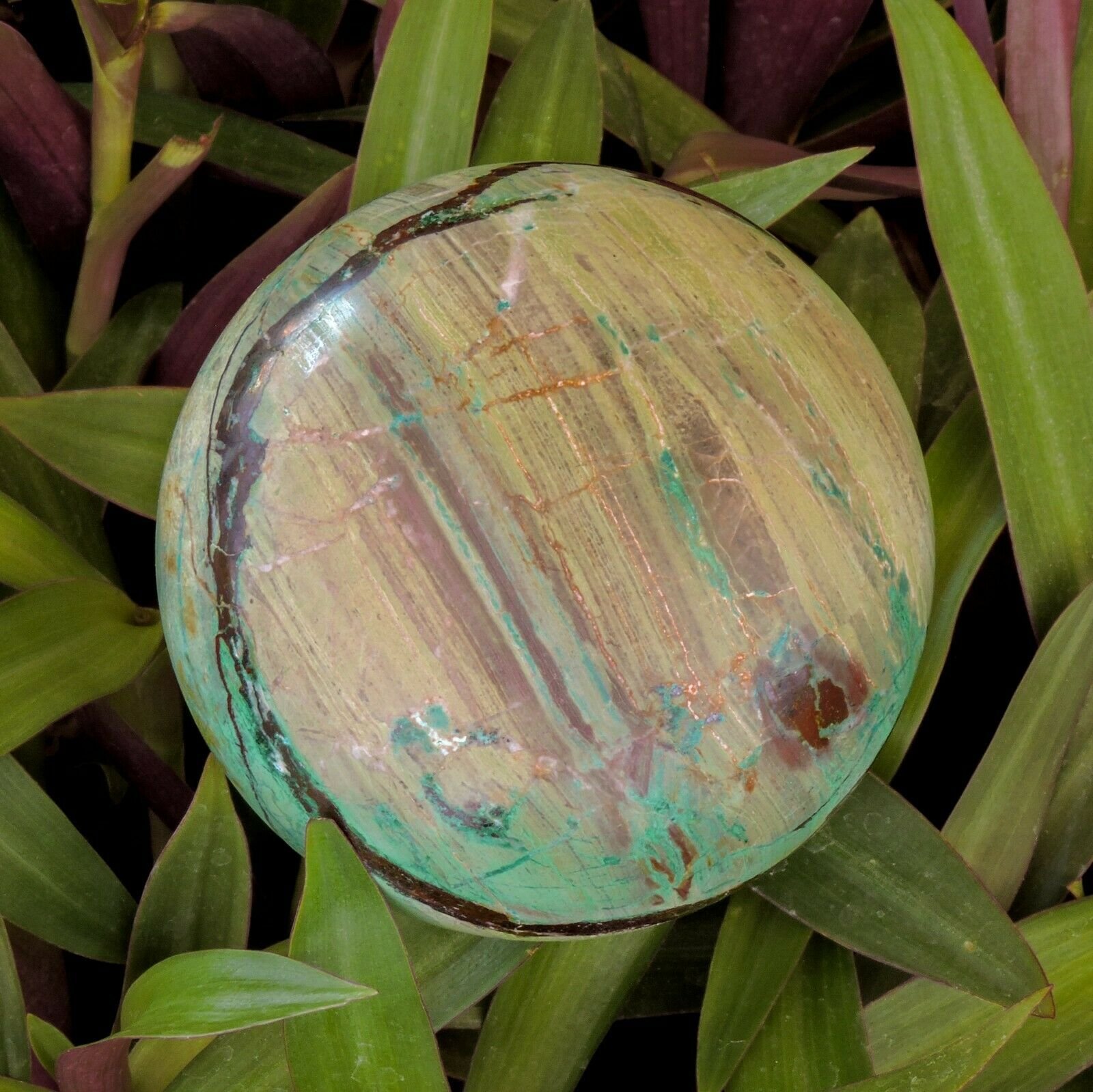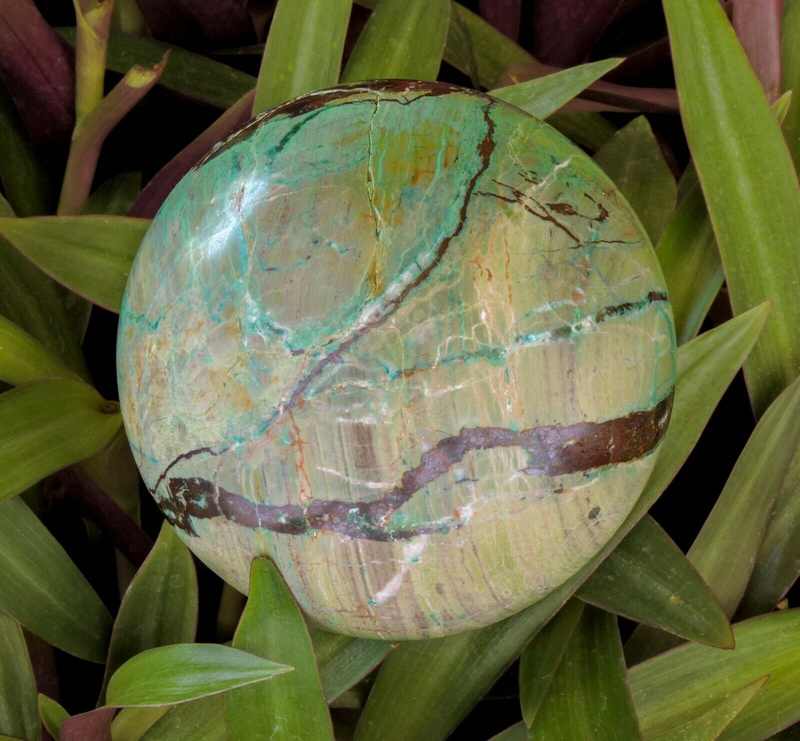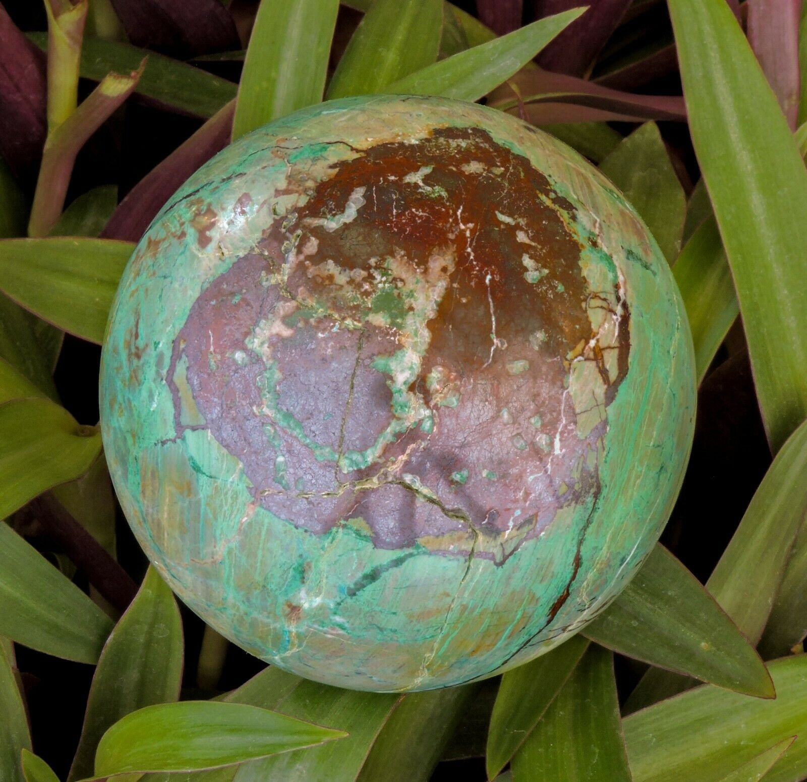 This is a large spectacular sphere of Chrysocolla, Malachite, Jasper and Ironstone. Its hard to get rough material to make this size as it can be very fragile and tends to shatter. The patterns of this are amazing.