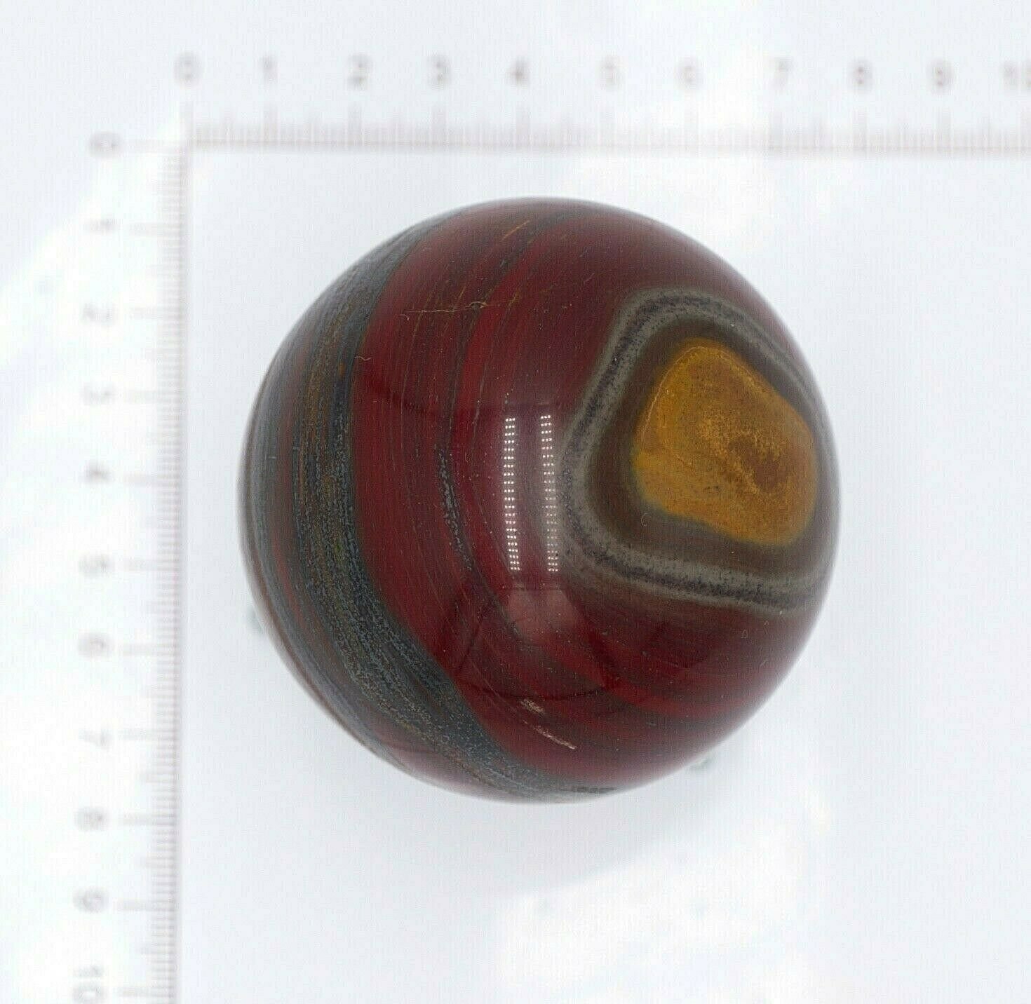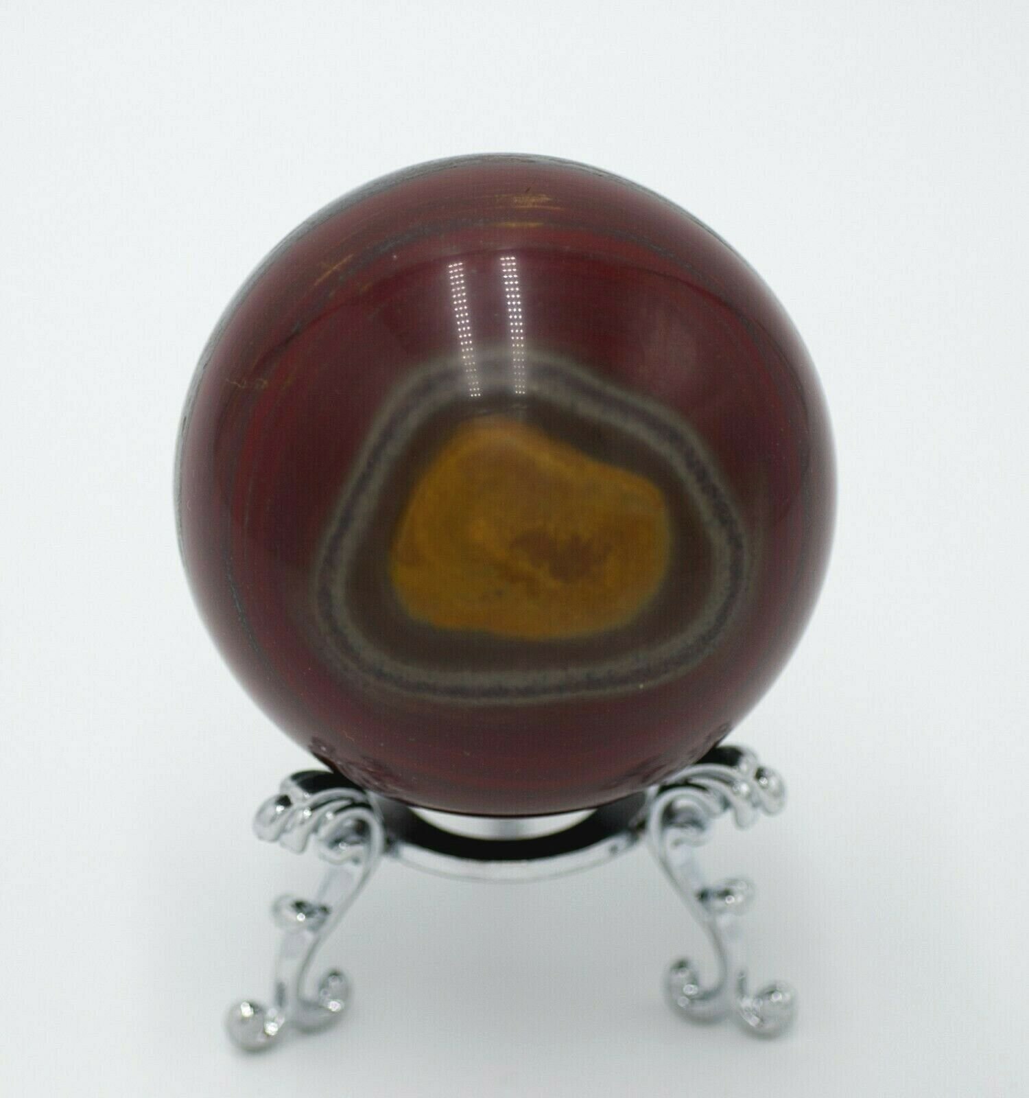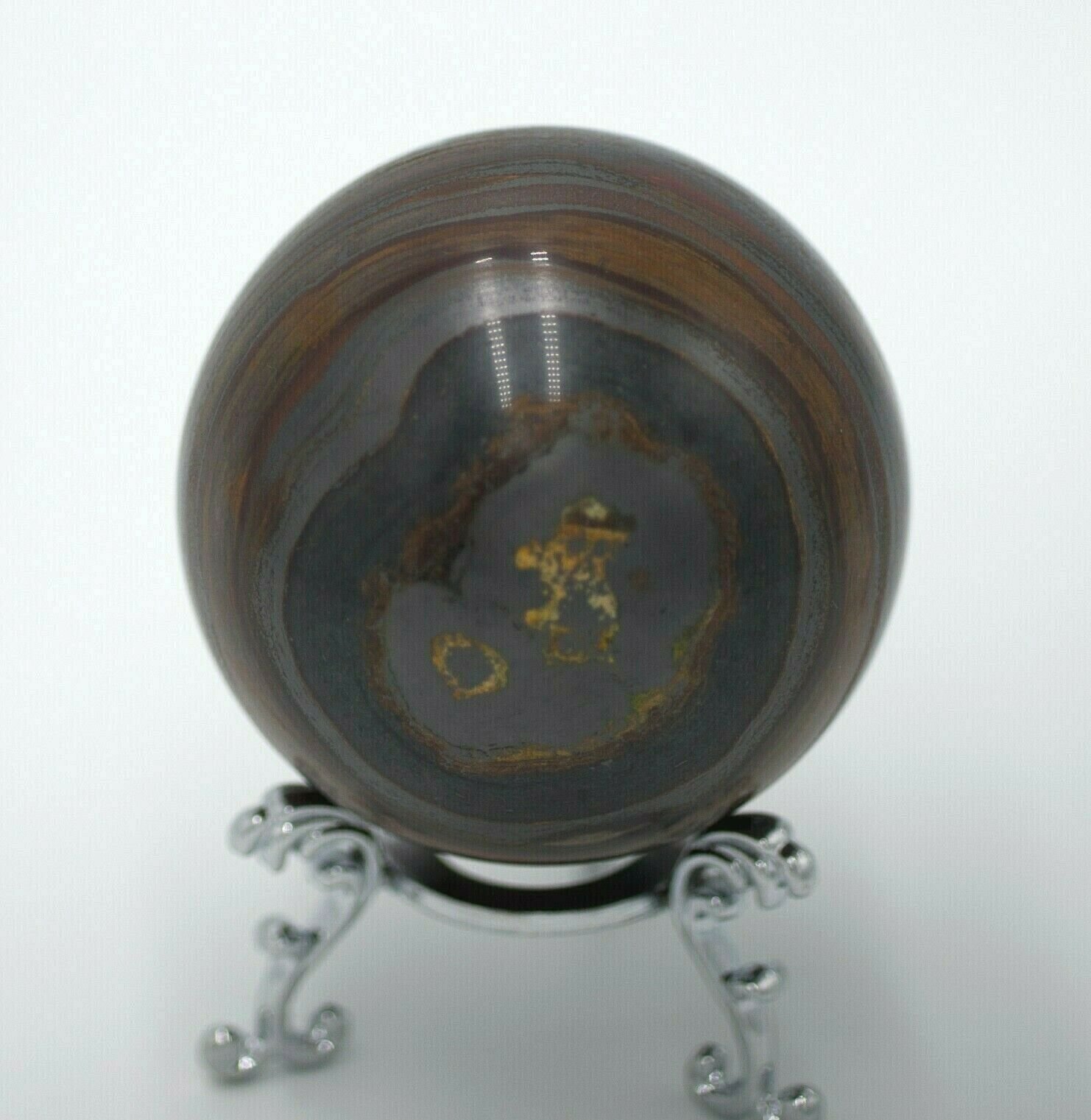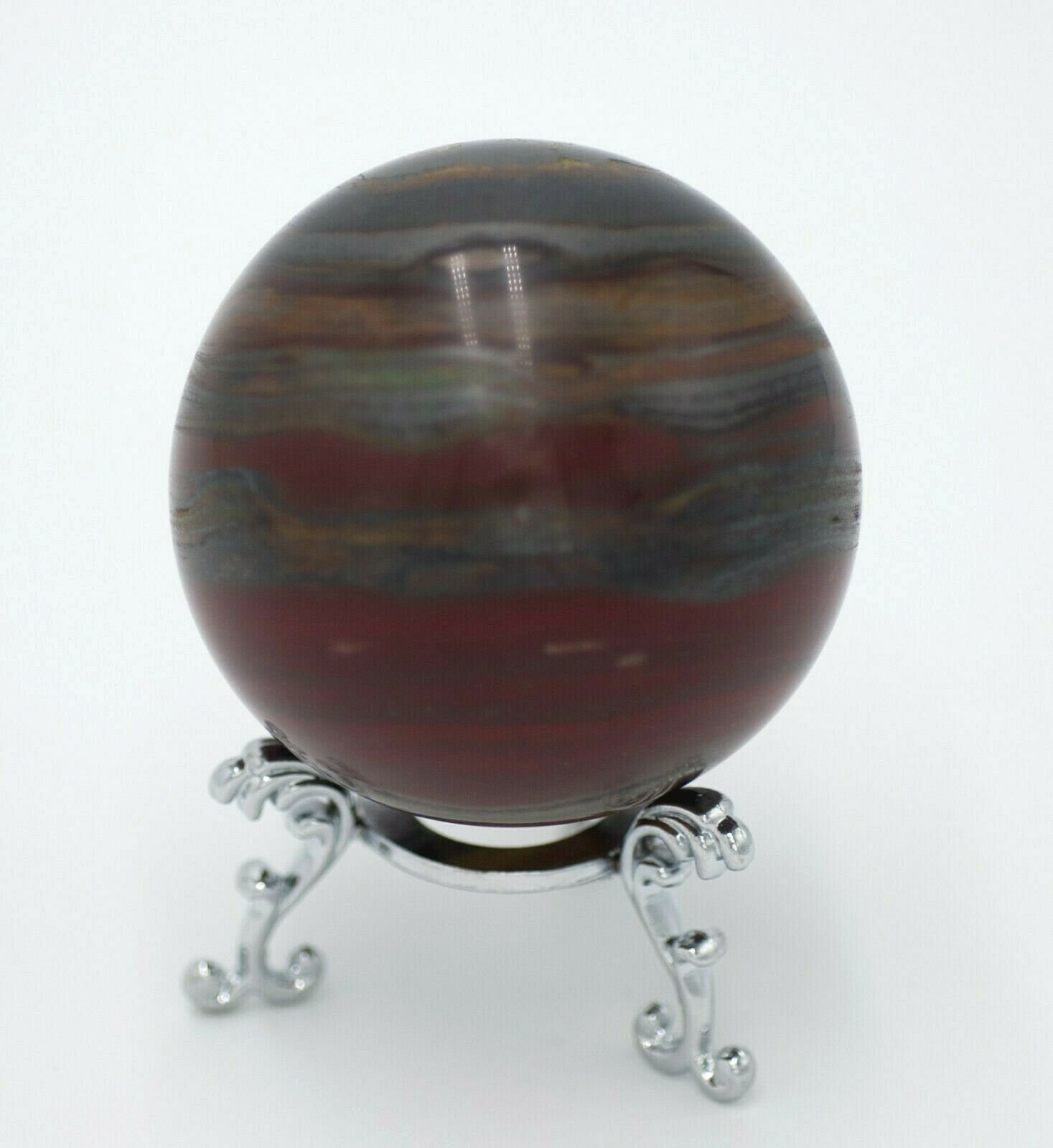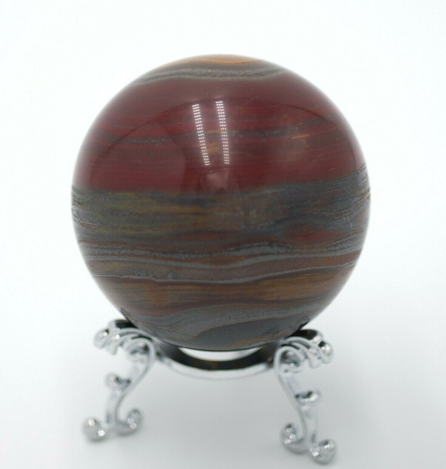 Highly polished banded iron formation. The sphere contains jaspers and hematite