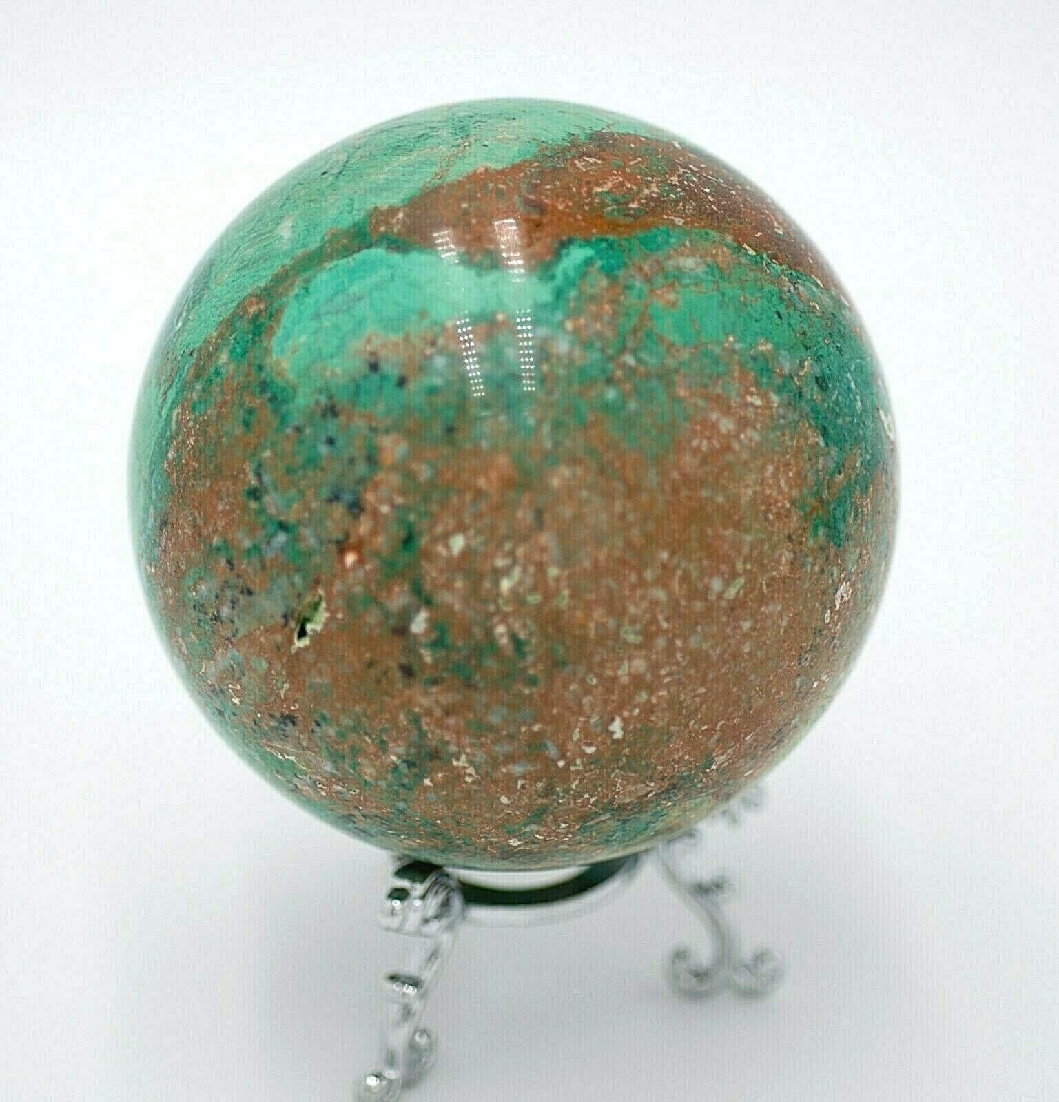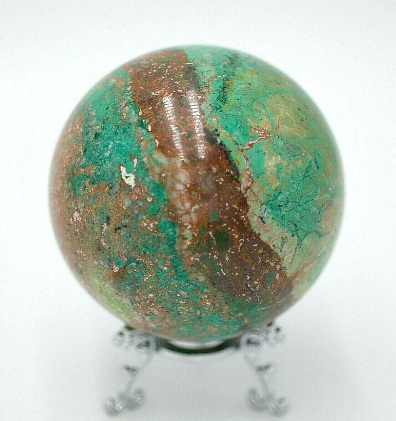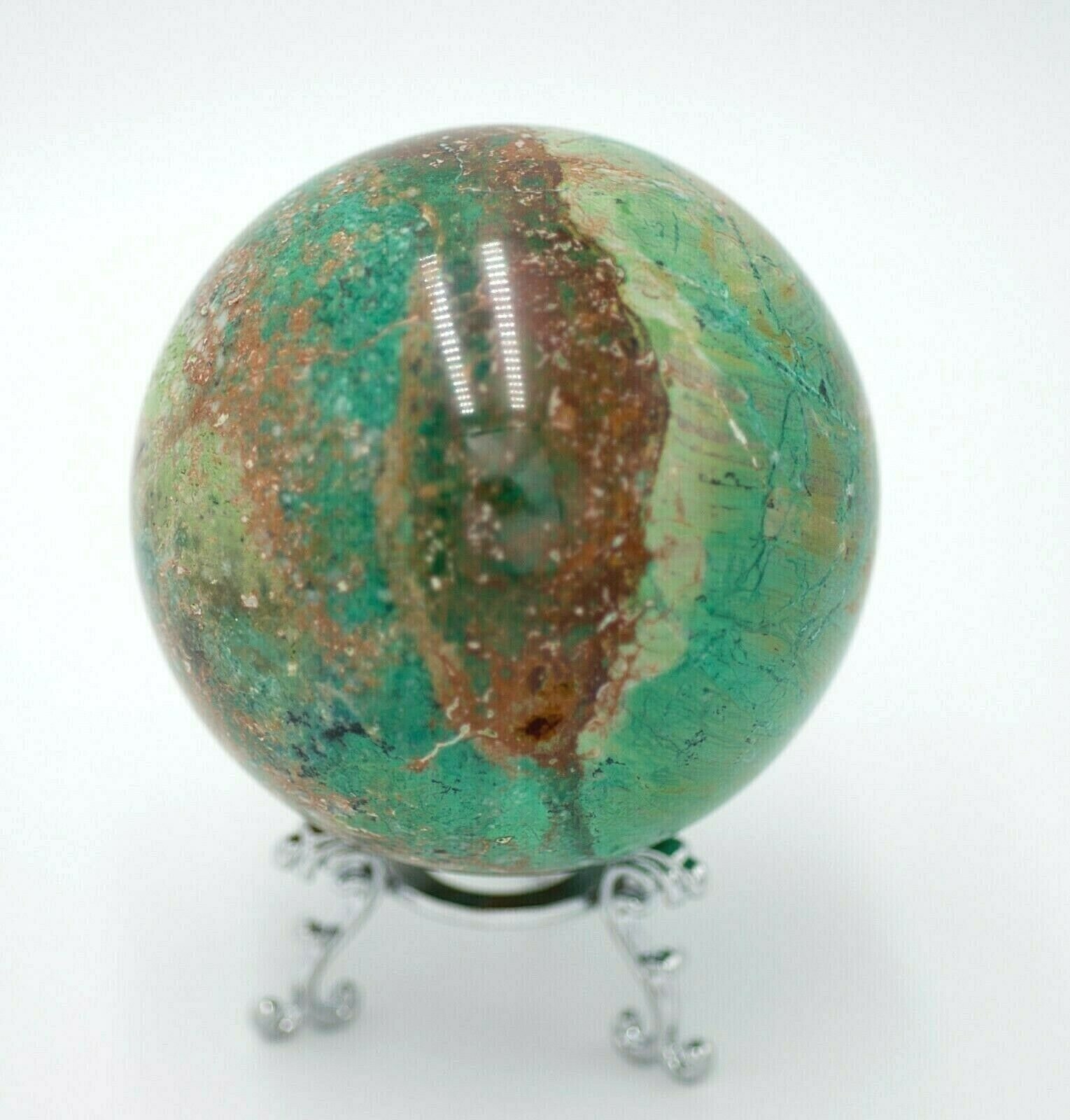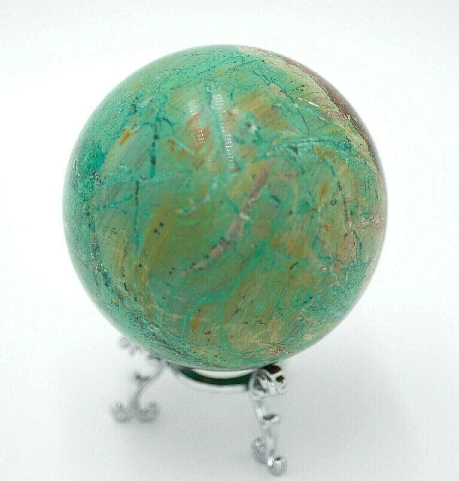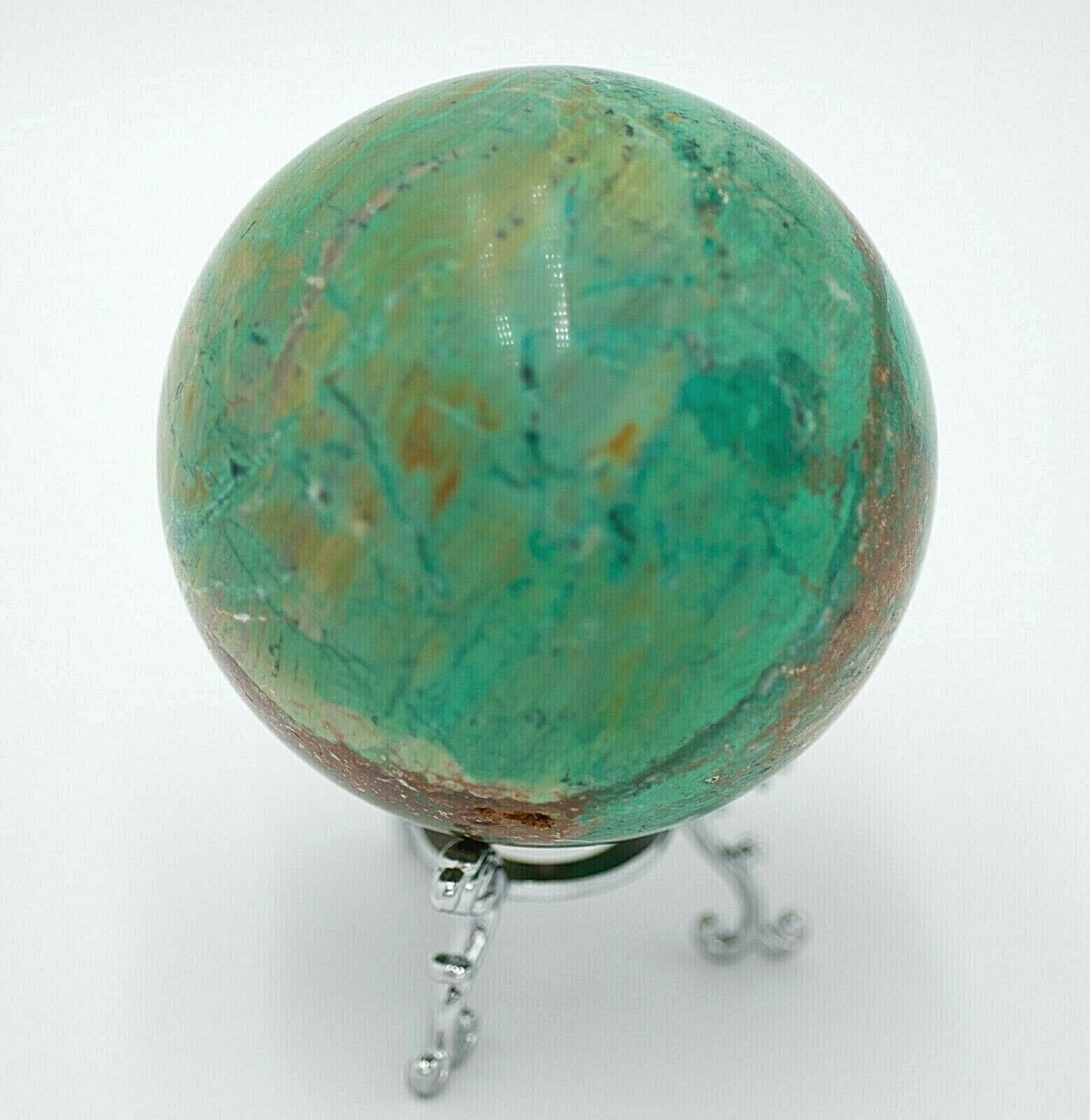 This is a large spectacular sphere of Chrysocolla, Malachite, Jasper and Ironstone. Its hard to get rough material to make this size as it can be very fragile and tends to shatter. The patterns of this are amazing.