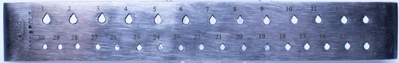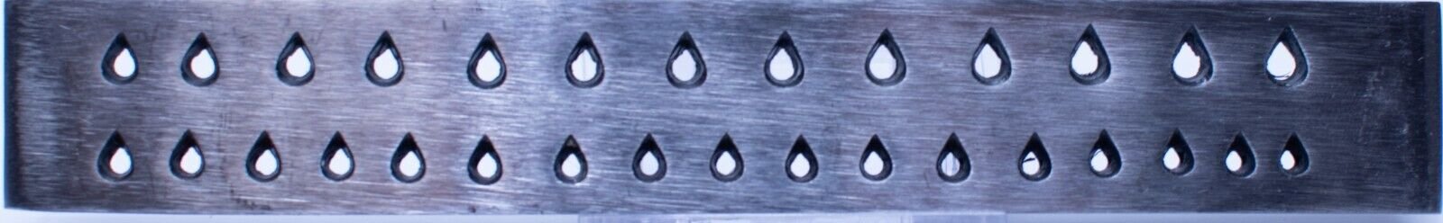 30 tear drop shaped holes. Holes are tapered from the back to the front.
