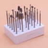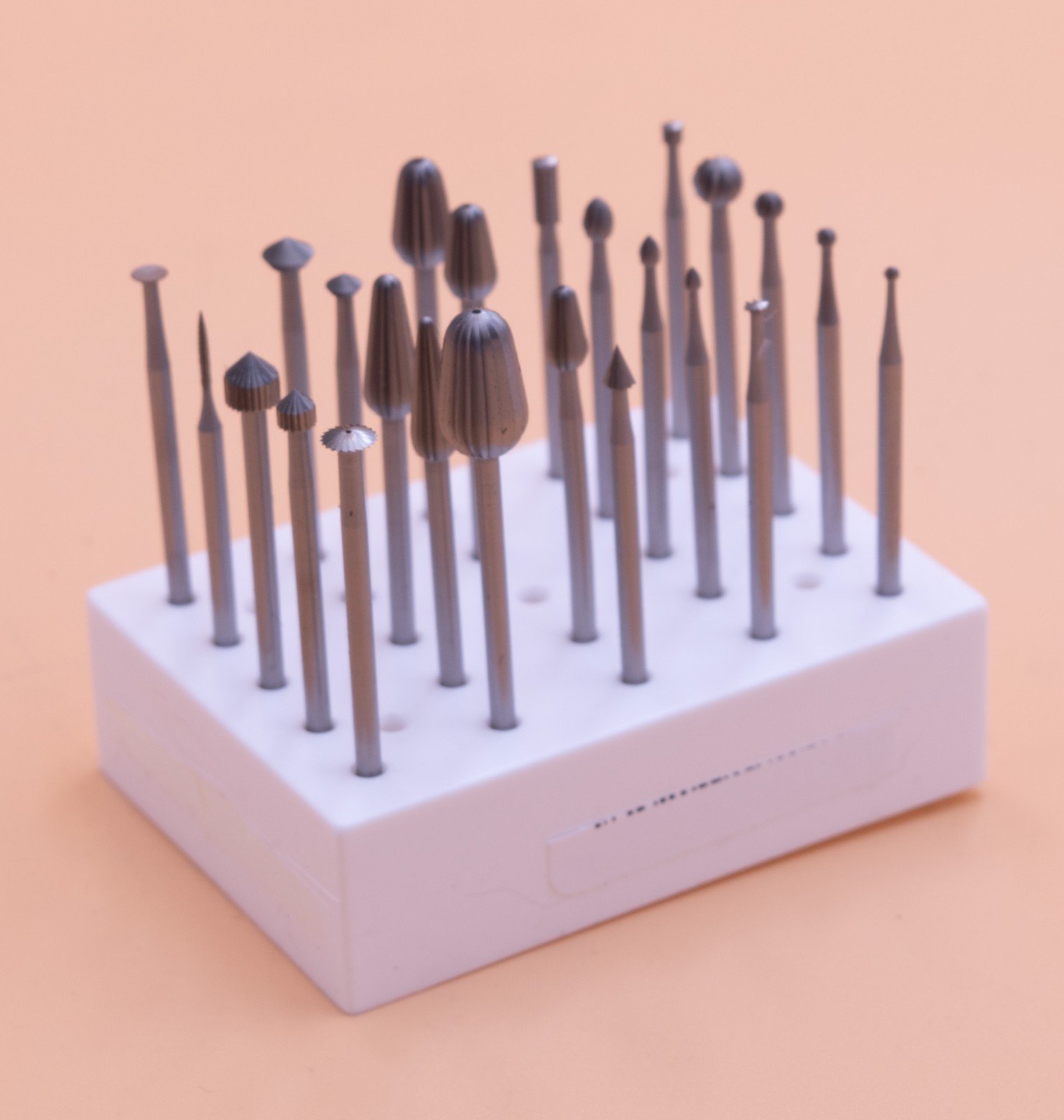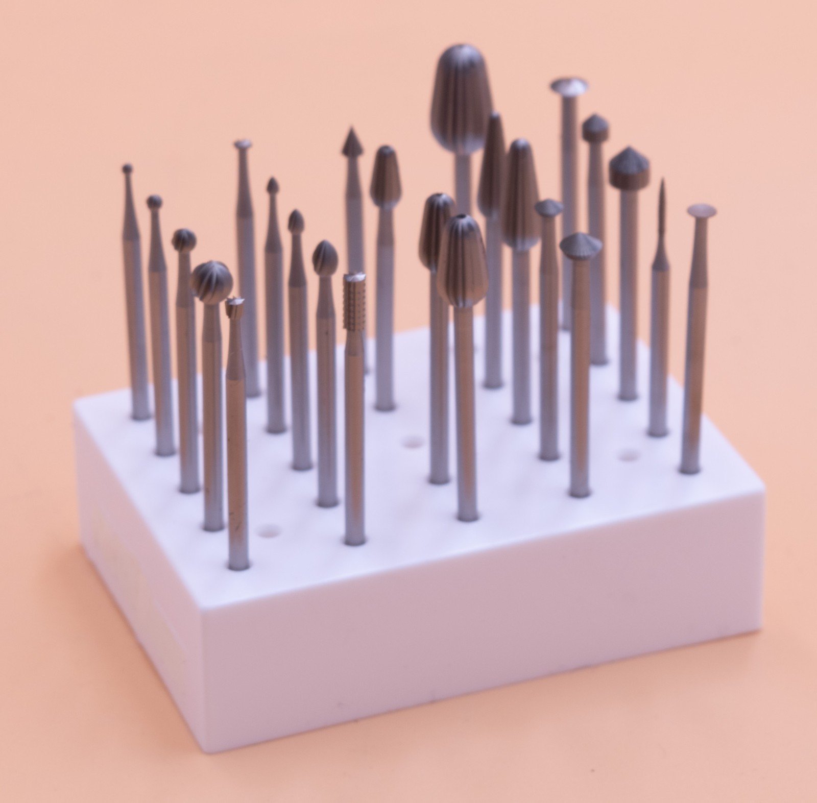 This set includes 24 burs: • Four round burs: 1.5, 2, 3 and 5mm • Two cup burs: 1.5 and 3mm • Three wheel burs: 2.5, 2.9 and 3mm • Five bud burs: 1.5, 2.1, 3.1, 4.5 and 5mm • One round cylinder bur: 2.3mm • One cylinder bur, coarse: 5mm • One inverted cone bur: 2.9mm • One long bud bur: 5mm • One oval bur, coarse: 5mm • One egg bur, Coarse: 5mm • One pear bur, coarse: 5mm • One Hart bur: 3mm • One knife-edge bur: 5mm