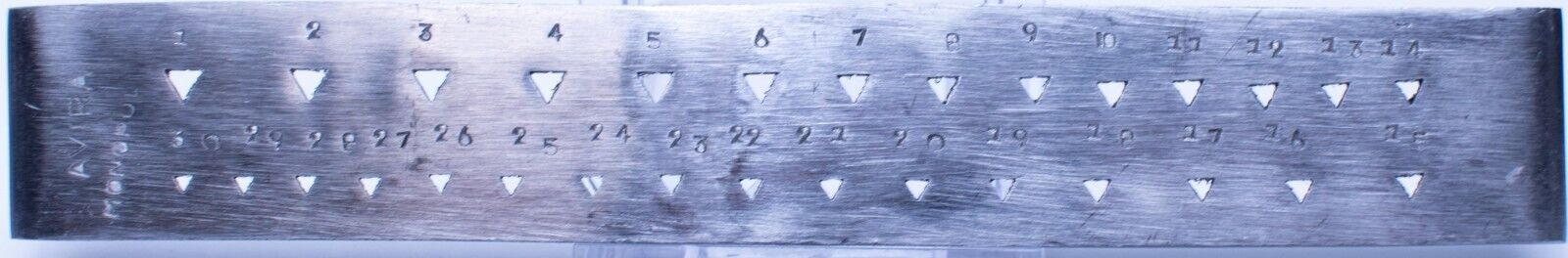 30 triangle shaped holes. Holes are tapered from the back to the front.